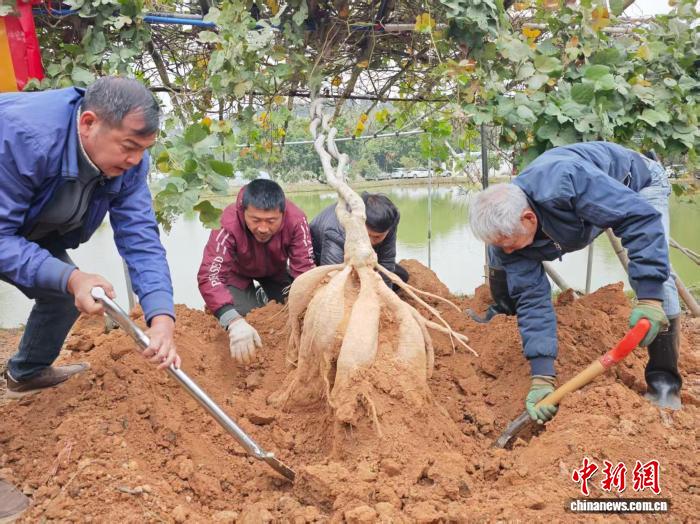 中新网江门1月23日电 (记者 郭军)“广货行天下”江门食品饮料专场促销活动暨2026年“鹤山·共和粉葛节”23日在侨乡广东江门鹤山共和镇平汉村大缘合泉水谷粉葛种植基地拉开序幕。活动现场挖出重达85斤的“葛王”。