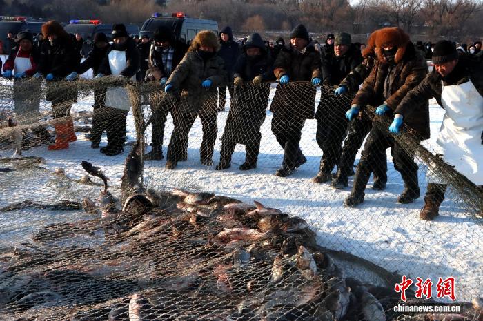 随着渔工们雄浑高亢的号子声响起,千米巨网破冰而出,万尾鲜鱼在冰面上欢腾跳跃,引得现场游客阵阵喝彩。 赵雅飞 摄
