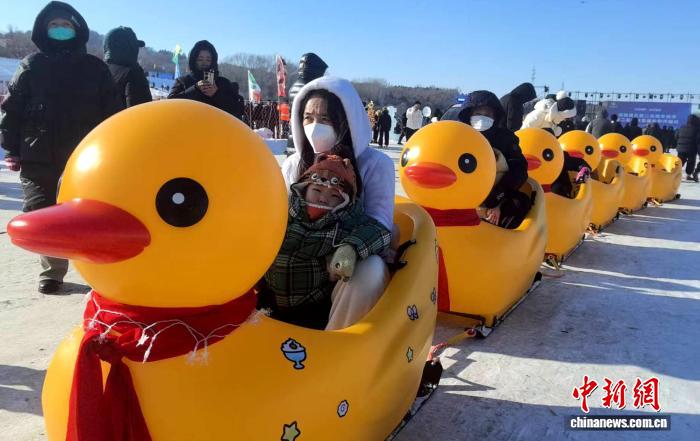 家长带着孩子在二龙湖冰雪嘉年华园区体验冰雪娱乐项目。 姜辉 摄