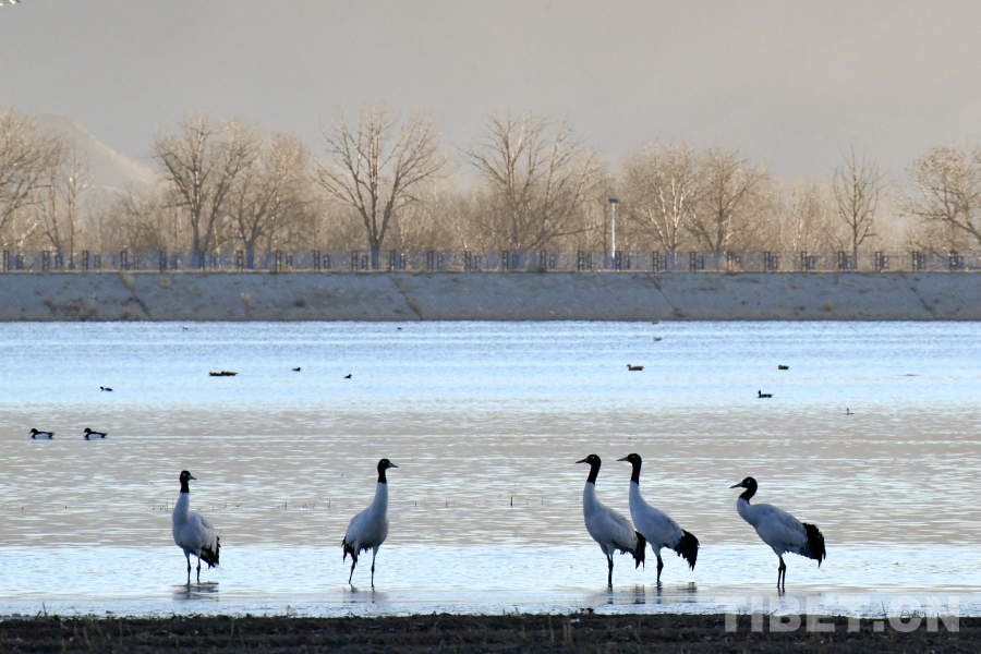 中国西藏网讯 清晨的拉萨林周,当一天中第一缕阳光刚刚照向大地之时,卡孜水库里第一批早醒的黑颈鹤伴随着鹤类特有的鸣叫,三五成群地开始起飞外出觅食,这是属于冬日拉萨独有的鹤舞美景。