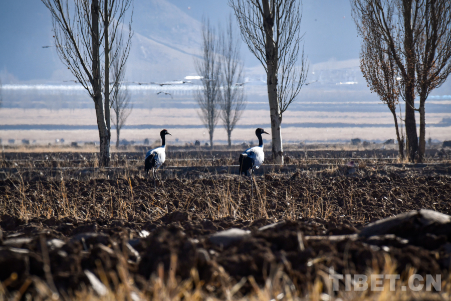 图为拉萨市林周县境内正在田野中觅食的黑颈鹤(摄于11月23日)摄影:赵振宇