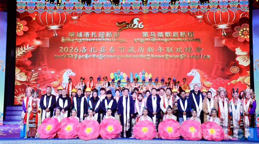 中国西藏网讯 金马踏春庆双节,边疆欢歌颂盛世。2月12日晚,西藏山南洛扎县2026年春节藏历新年联欢晚会在县影剧院上演,晚会以“幸福洛扎迎新岁 策马踏歌启新程”为主题,各族干部群众、各界代表500余人欢聚一堂,共庆双节、共话发展、共叙民族团结情谊。