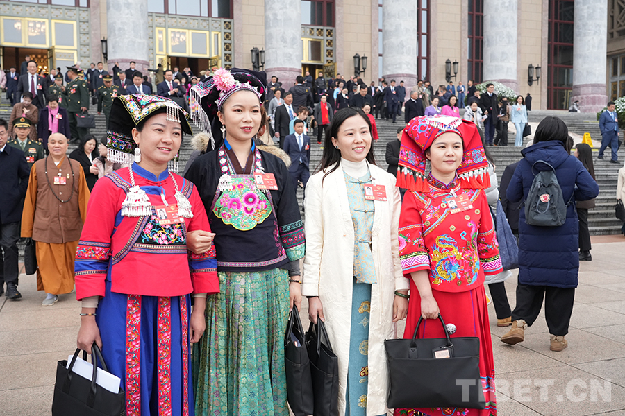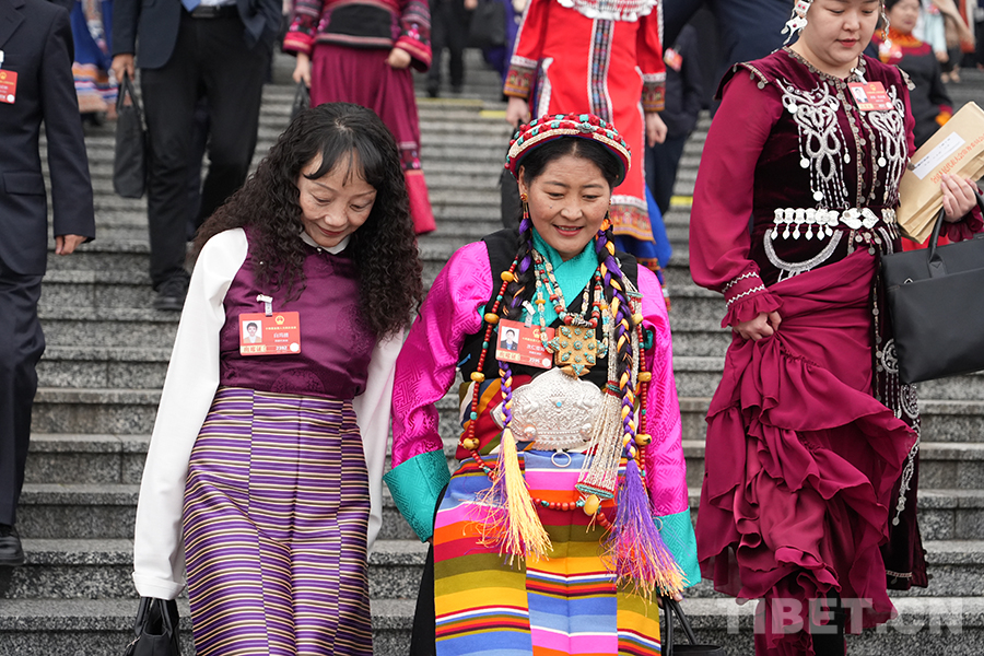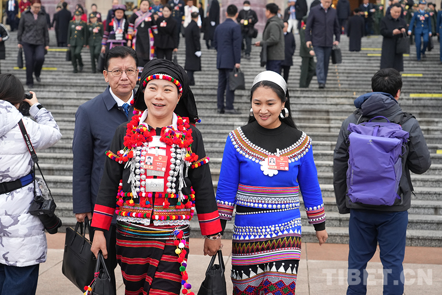 中国西藏网讯 3月5日上午,十四届全国人大四次会议在人民大会堂开幕。开幕会后,身着民族服饰的人大代表们信心满怀走出会场。(中国西藏网 记者/边子捷 刘莉)