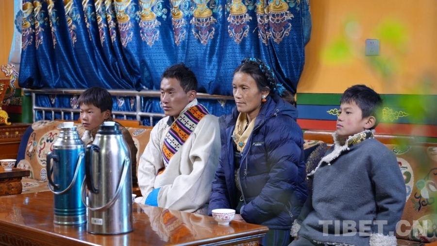 定日县长所乡森嘎村村主任尼玛次仁一家在新居中观看十四届全国人大四次会议开幕会 摄影:穷达