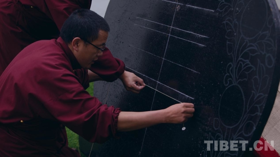 琼科寺僧人正在为即将制作的酥油花作品做度量准备