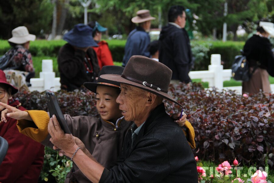 2025年8月24日雪顿节,拉萨市的藏族爷孙俩在罗布林卡享受节日时光。摄影:赵钊