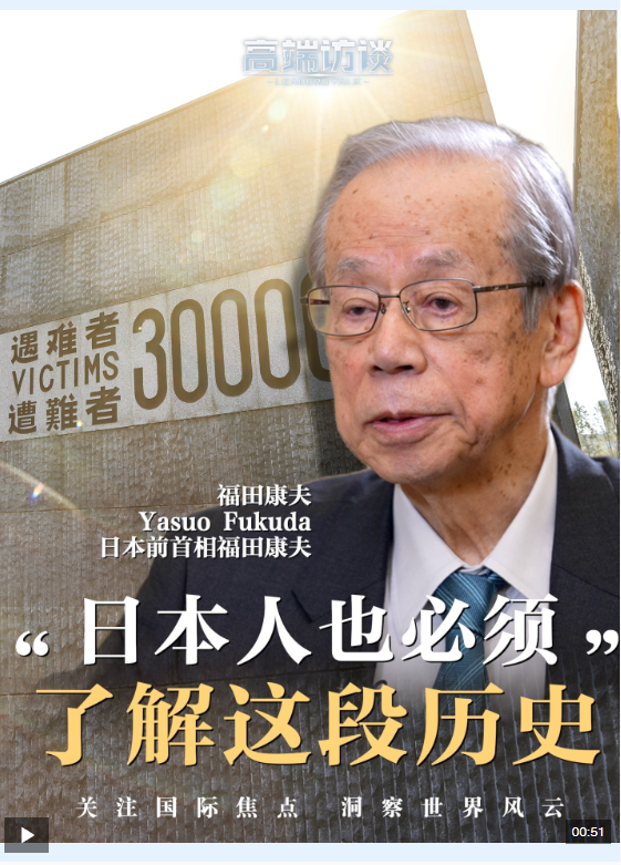 日本前首相福田康夫曾在2018年参观侵华日军南京大屠杀遇难同胞纪念馆,他是第四位参观的日本前首相。接受总台《高端访谈》专访时,他说,日本人也必须了解这段历史。