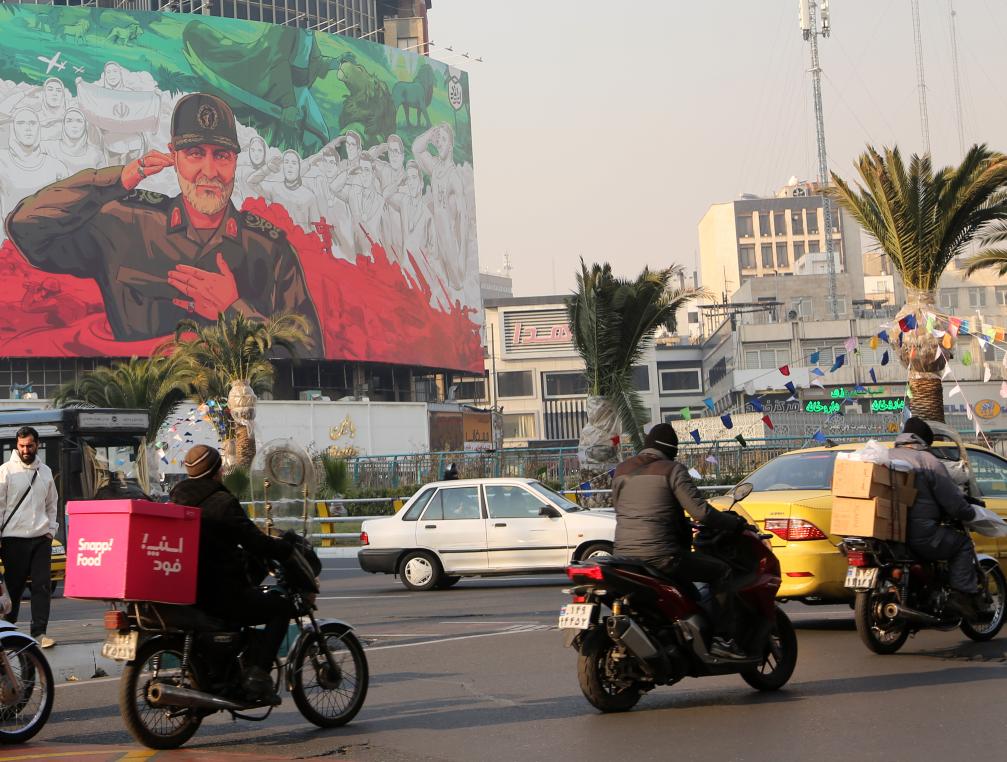 2026年1月6日,在伊朗首都德黑兰街头,车辆经过一幅绘有伊遇袭身亡的高级将领卡西姆·苏莱曼尼形象的宣传海报。新华社发