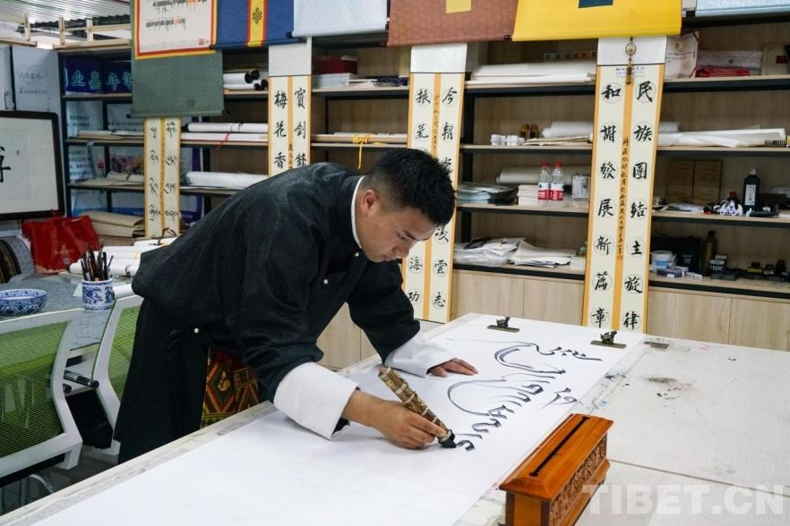 图为西藏民族大学学生扎西曲吉在练习藏文书法 摄影:吕静