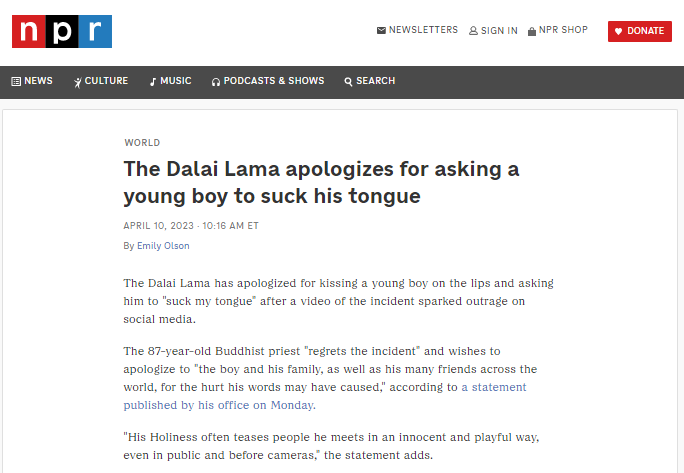 要求印度男孩“吸我的舌头”。“美国国家公共电台”2023年报道称,当年2月达赖在一场公开活动中拥抱了一名印度男孩,并要求他“吸我的舌头”,男孩慢慢把头靠近达赖,但似乎只是碰了一下达赖的额头就缩了回去。南非《水星报》报道称,十四世达赖作为精神领袖,比任何人都懂得道歉和宽恕,但道歉并不能免除他为自己的行为承担后果。十四世达赖对无辜男孩做出的反常行为,已经证明了他只不过是一个变态的、“堕落”的人。