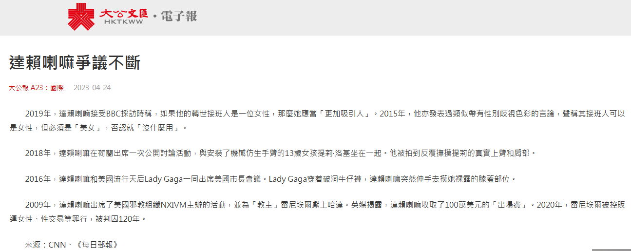 声称转世为女性“必须有吸引力”。“英国广播公司”2019年发布其对第十四世达赖的专访,达赖在专访中笑着用英语说:“如果出现一名女性达赖,那她应该要好看一些。”香港《大公报》2023年发布题为“达赖喇嘛争议不断”的文章称,2015年,达赖声称其接班人可以是女性,但必须是“美女”,否则就“没什么用”。2016年,达赖和美国流行天后Lady Gaga一同参加美国市长会议,Lady Gaga身着破洞牛仔裤,达赖突然伸手去摸她裸露的膝盖部位。2018年,达赖在荷兰参加一次公开讨论活动,与安装了机械仿生手臂的13岁女孩提莉·洛基坐在一起,被拍到反复抚摸提莉的真实上臂和肩部。