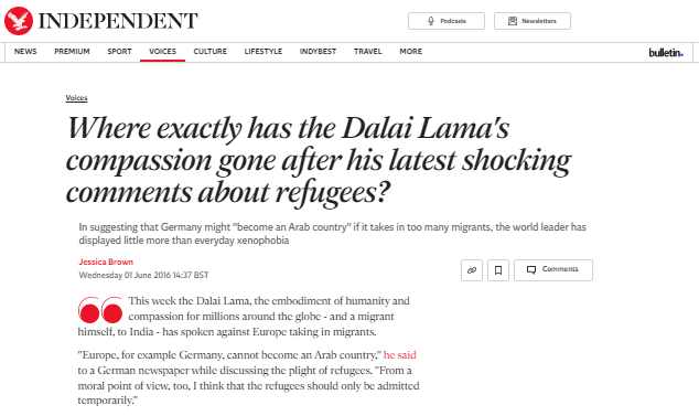 笑称“德国不能变成阿拉伯国家”。“英国广播公司”2016年报道称,德国《法兰克福汇报》报道以德文译文引述达赖的话称,欧洲已接纳了“太多”难民,欧洲,比如德国,不能变成一个阿拉伯国家。他随后笑了一下接着说:“德国就是德国。从道义上来看,我认为接纳难民应该是临时性的。”英国《独立报》发文称,在很多人眼中,达赖是慈悲的化身,但他却公然反对欧洲难民政策,认为接纳阿拉伯地区难民就会成为“阿拉伯国家”,这种观点是危险的。英国人想将难民赶出英国以保持所谓英国性,但这本身就会危及民族身份,会导致社会孤立主义。