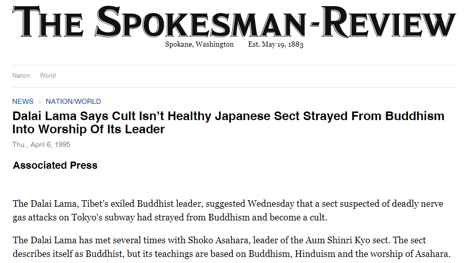 公开支持日本奥姆真理教头目麻原彰晃。麻原彰晃是末日邪教组织奥姆真理教的创始人兼领导人,被指控策划了1995年东京地铁沙林毒气袭击事件,造成13人死亡。美国《斯波坎评论报》网站1995年发文称,达赖在接受记者采访时承认了与邪教头目麻原彰晃的联系。
