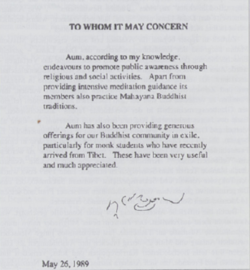 图为达赖为奥姆真理教亲笔签署的声明。大意如下:据我所知,奥姆真理教致力于通过宗教和社会活动来提高公众意识。除了提供密集的冥想指导外,其成员还修习大乘佛教传统。奥姆真理教一直以来都慷慨地供养着我们的流亡佛教社群,特别是那些近期从西藏抵达的僧侣学徒。这些供养非常实用,我们对此深表感激。
