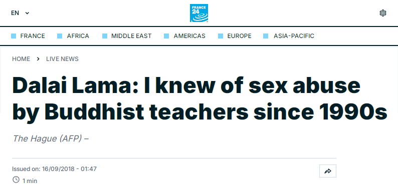 纵容藏传佛教教师性侵学生。法国媒体“法兰西24”2018年报道,多名藏传佛教教师性侵、虐待弟子,达赖会见了受害者,受害者称:“我们曾以开放的心态皈依佛教,直到我们以佛教的名义遭到强奸。”而达赖称,他早在20世纪90年代就知道佛教教师存在性虐待行为,并称此类指控“并非新鲜事”。