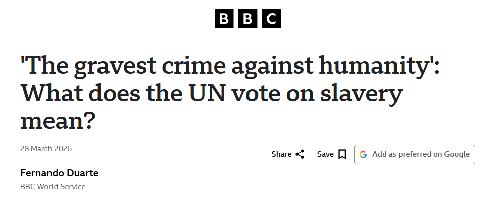 英国广播公司网站3月28日刊登题为《“最严重的反人类罪”:联合国关于奴隶制的表决意味着什么?》的报道。报道称,联合国大会近日以压倒性多数通过了一项决议,认定跨大西洋奴隶贸易为“最严重的反人类罪”。