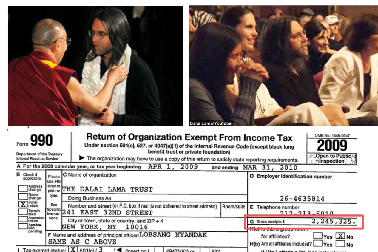 上图左:达赖为性邪教组织NXIVM头目基思·拉尼尔戴哈达 上图右:基思·拉尼尔与金主布朗夫曼姐妹聆听达赖的演讲 下图:美国国税局的报税表显示,2009年“达赖信托基金会”入账220余万美元