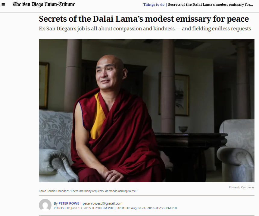 2015年丹增东登接受美国《圣地亚哥联合论坛报》采访。该媒体当时称其为“达赖喇嘛谦逊的和平使者”,现在读来颇感讽刺。