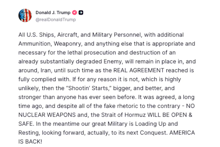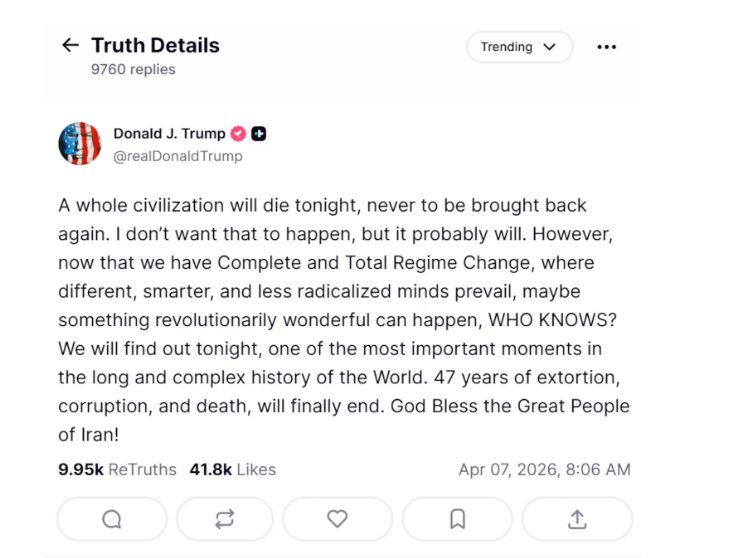 特朗普在真实社交平台发布的贴文,发文威胁伊朗称,“今晚,整个文明将消亡”