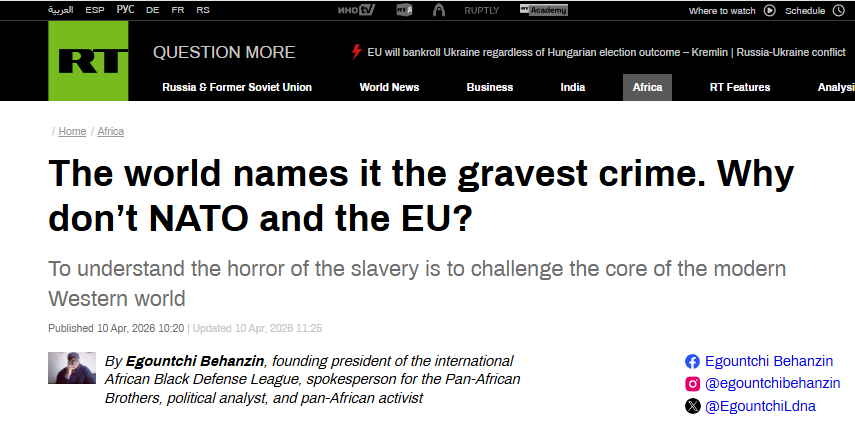俄罗斯新闻网站《今日俄罗斯》4月10日刊发题为《联合国将奴隶制定性为最严重罪行,北约和欧盟为何选择回避?》的评论性文章,作者是埃贡奇·贝汉津(Egountchi Behanzin),文章编译如下: