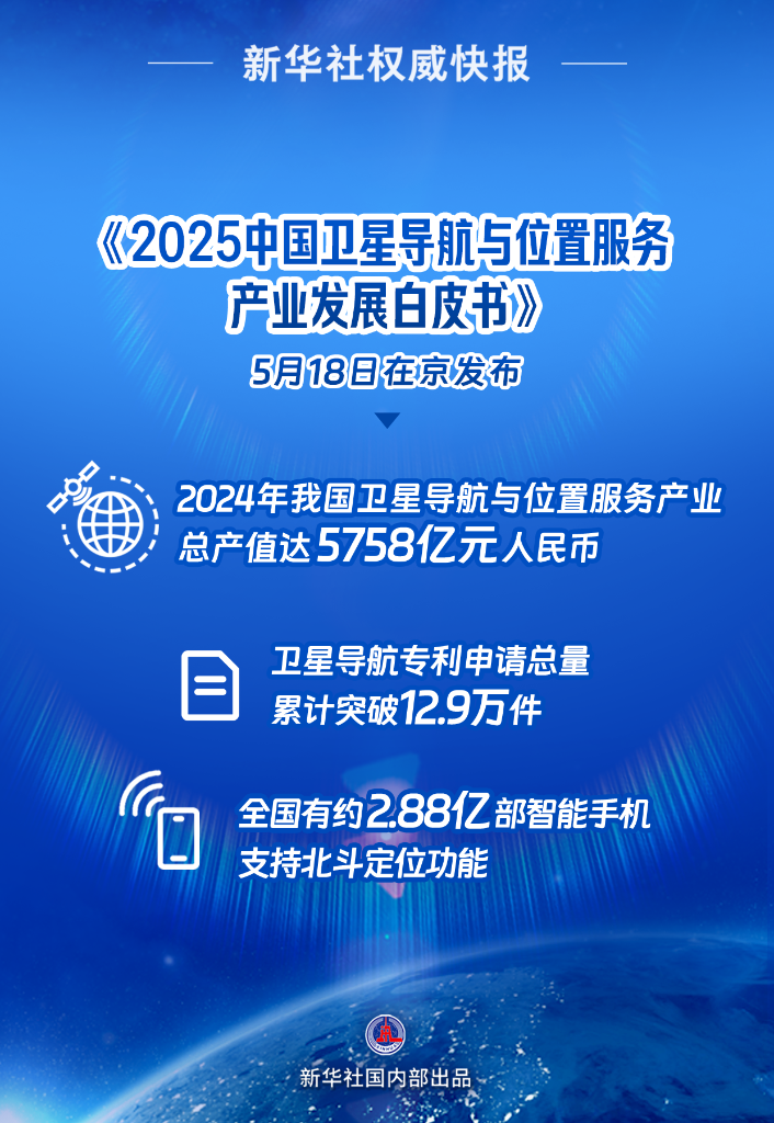 5月18日在京发布的《2025中国卫星导航与位置服务产业发展白皮书》显示,2024年我国卫星导航与位置服务产业总产值达5758亿元人民币,同比增长7.39%;卫星导航专利申请总量累计突破12.9万件,继续保持全球领先。