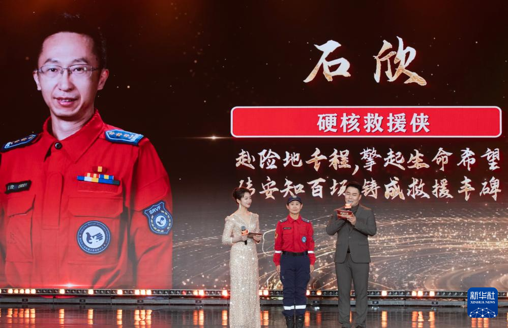 1月28日,由新华社主办的“中国网事·感动2025”公益盛典暨年度颁奖典礼在北京举行,活动揭晓“中国网事·感动2025”十大年度网络人物。这是“硬核救援侠”石欣的代表(中)出席颁奖典礼。新华社记者 李安 摄