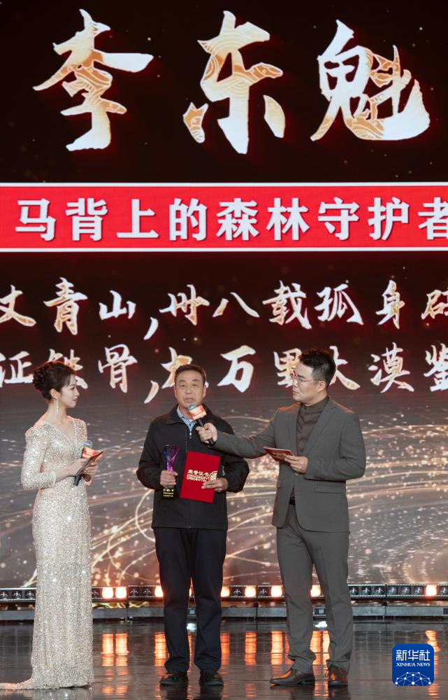 1月28日,由新华社主办的“中国网事·感动2025”公益盛典暨年度颁奖典礼在北京举行,活动揭晓“中国网事·感动2025”十大年度网络人物。这是“马背上的森林守护者”李东魁(中)出席颁奖典礼。新华社记者 李安 摄