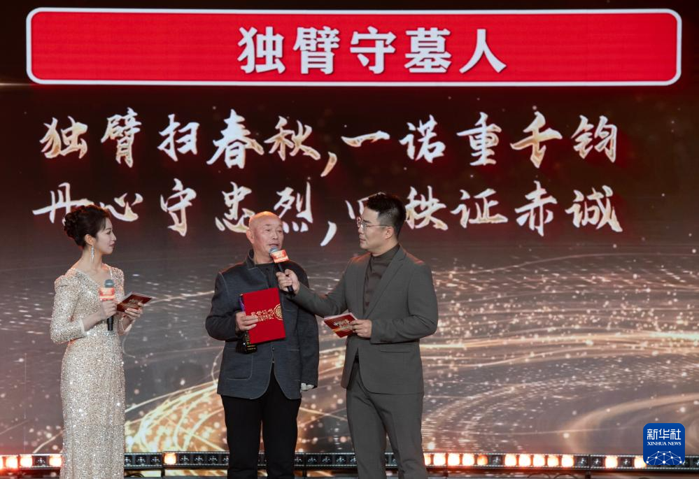 1月28日,由新华社主办的“中国网事·感动2025”公益盛典暨年度颁奖典礼在北京举行,活动揭晓“中国网事·感动2025”十大年度网络人物。这是“独臂守墓人”蔡恩坤(中)出席颁奖典礼。新华社记者 李安 摄
