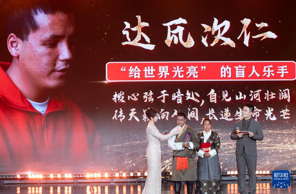 1月28日,由新华社主办的“中国网事·感动2025”公益盛典暨年度颁奖典礼在北京举行,活动揭晓“中国网事·感动2025”十大年度网络人物。这是“‘给世界光亮’的盲人乐手”达瓦次仁(左二)出席颁奖典礼。新华社记者 李安 摄