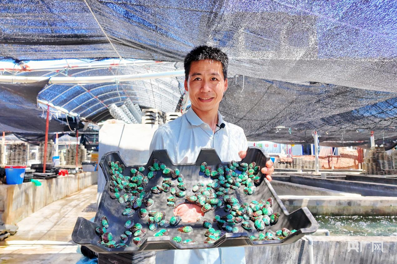 澳角村村民陈泽贤展示自家培育的鲍鱼苗(央广网记者 龚雯 摄)