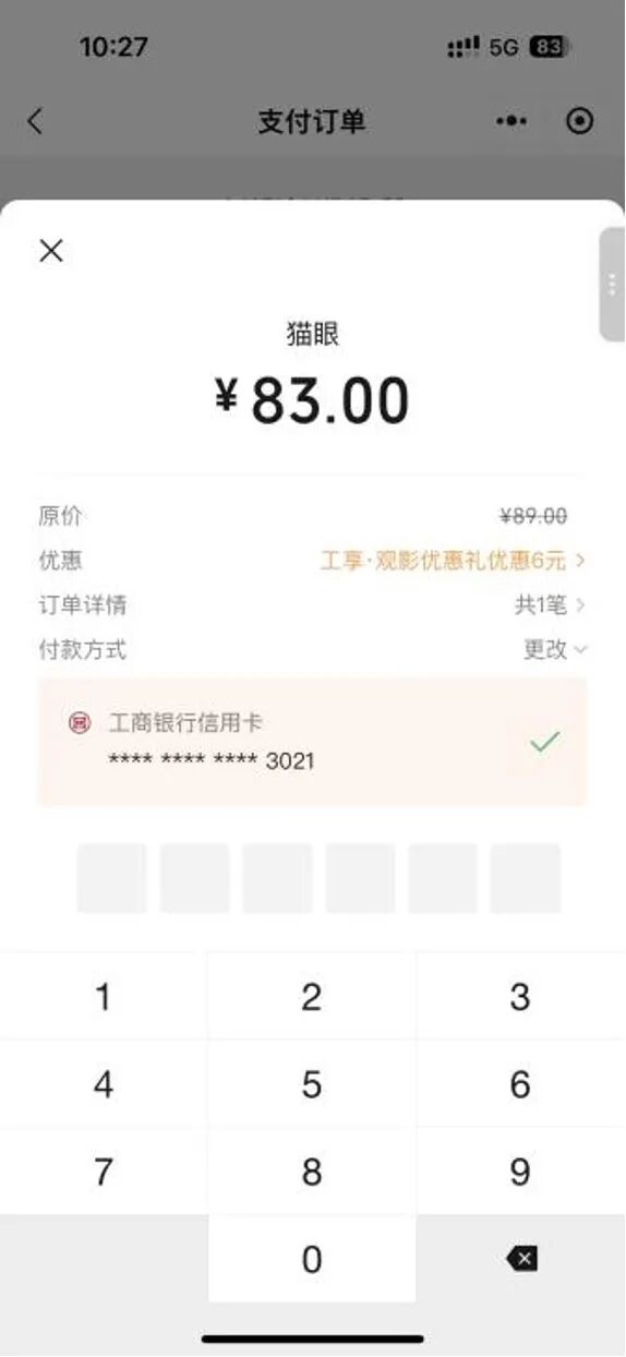 登录猫眼App或微信小程序,进入电影频道,进行影院/影票/场次选择,随后进入订单页,确认后选择用微信支付,并用绑定的工行卡结账可确认最终优惠信息(用户在此步骤才能看到实际优惠)。