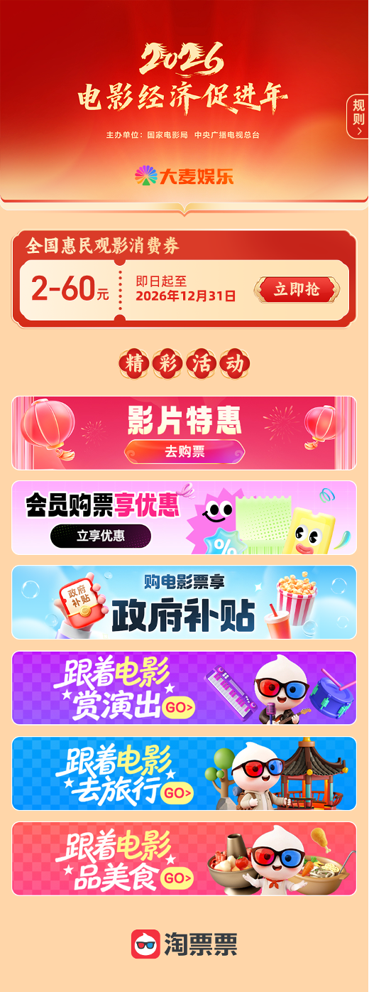 2026年2月12日至12月31日,用户可登录淘票票App或通过微信淘票票小程序、支付宝淘票票小程序、淘宝淘票票小程序首页“电影经济促进年”活动入口,参与2-60元抽奖活动,并同步享受政府补贴、影片特惠、淘麦VIP积分礼包等多元优惠。权益详情以活动页面实时展示为准。