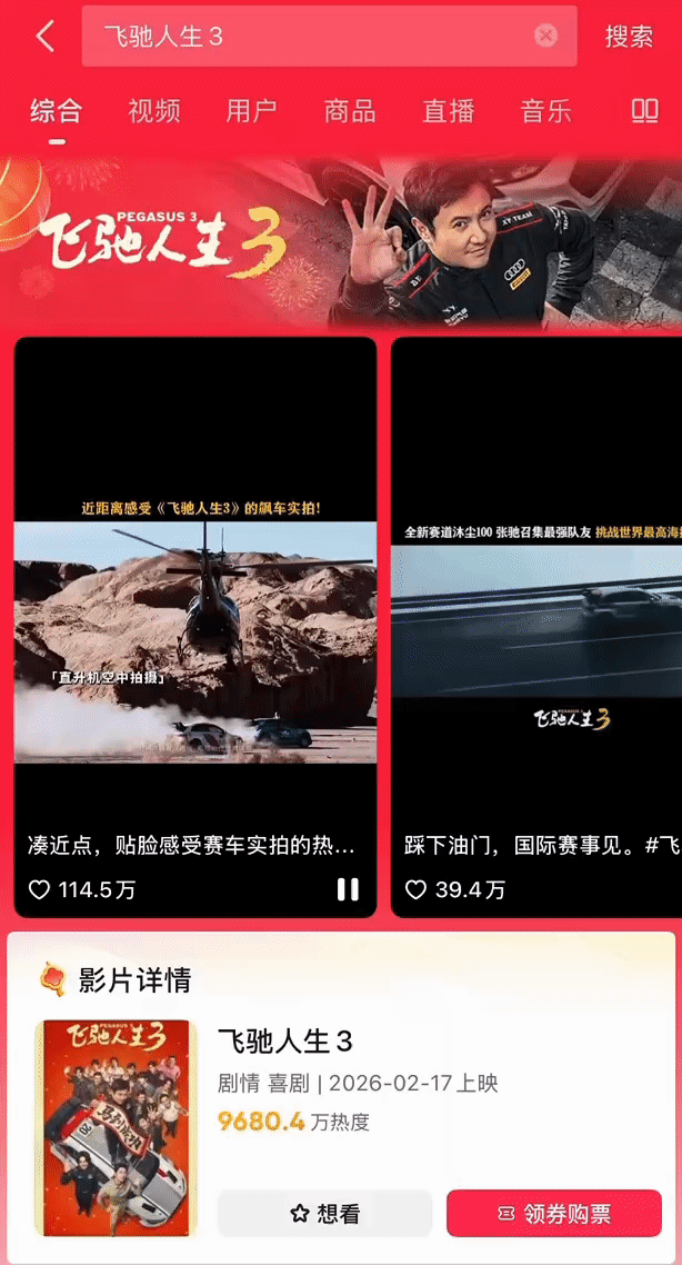 2026年2月10日至2026年2月28日,用户可以通过抖音App、抖音极速版App、抖音火山版App任一渠道,搜索春节档影片名进入春节电影会场页面,点击【领券购票】即有机会领取选座购票优惠券;活动期间还可浏览选购影院优惠团购,套餐福利享不停!