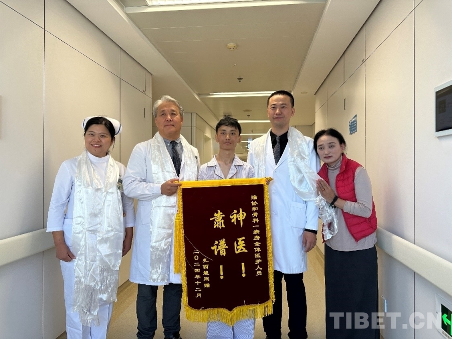 图为受到救助的藏族患者向北京协和医院骨科医疗团队赠送锦旗 摄影:杨眉笑