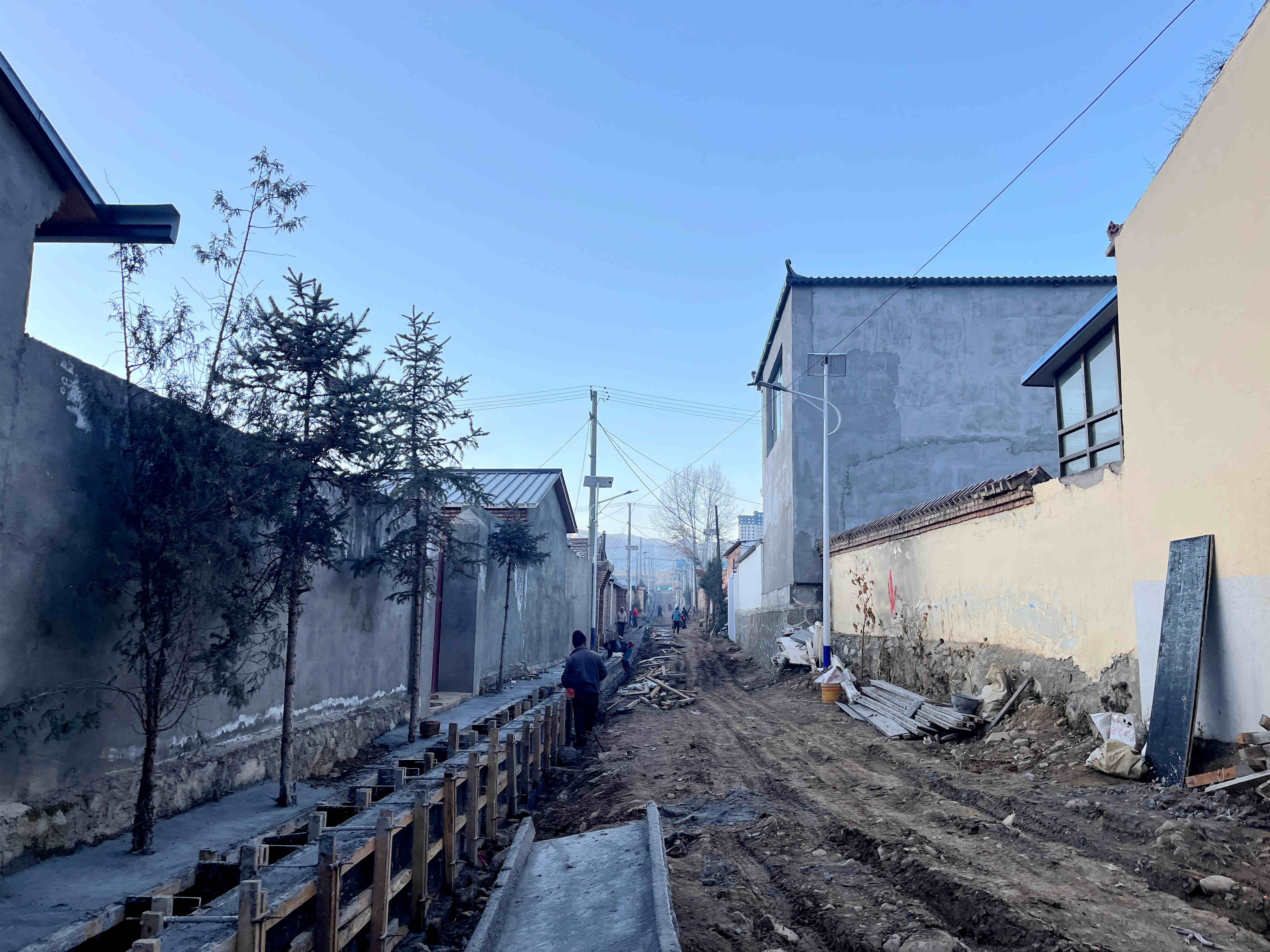 泽库县拉卡移民点,工人正在修建雨水边沟