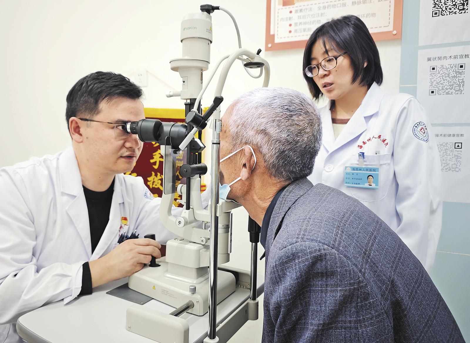 2025年12月26日下午,海西蒙古族藏族自治州人民医院门诊B015诊室里,医院眼耳鼻喉科主任、援青医生刘辉正专注为一位藏族老人复查眼部情况。因老人不会讲普通话,刘辉便借助助理翻译耐心问诊,辅以手势引导检测。