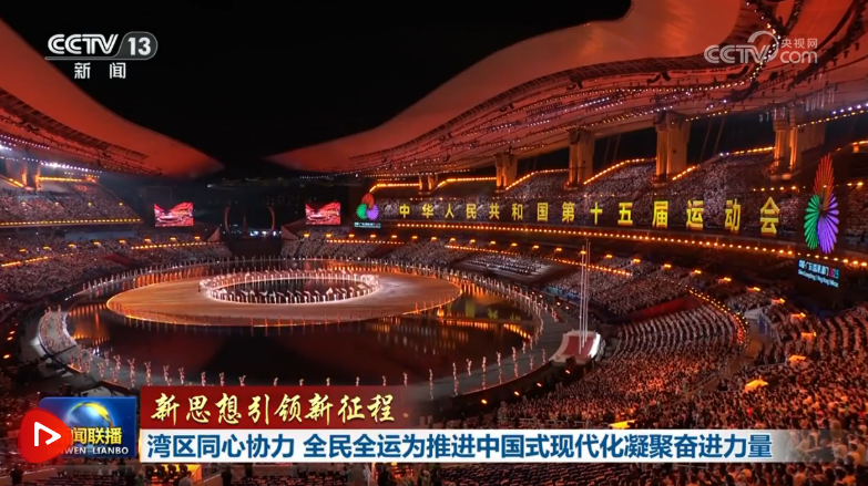 央视网消息(新闻联播):习近平总书记近日在广东考察并出席第十五届全运会开幕式时指出,通过举办这场盛会,可以激发爱国热情,拉紧精神纽带,促进开放合作、互利共赢,为大湾区建设营造良好氛围。从11月9日至21日,由粤港澳三地共同举办的这届全运会,燃动大湾区,生动诠释体育的激情与魅力;三地同心协力、交流融合,让大湾区焕发新的光彩。11月21日晚,本届全运会闭幕。这届盛会不仅展示了新时代中国体育事业发展的新成就,也生动展现了中国式现代化在粤港澳大湾区的万千气象。