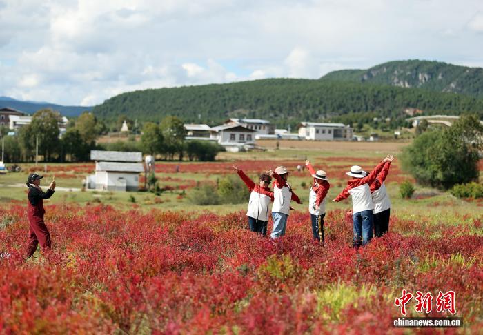 9月28日,游客在小中甸打卡。当日,入秋的云南省迪庆藏族自治州香格里拉市,狼毒变红,树叶变黄,风景如画,吸引各地游客前来观光。中新社记者 黄兴鸿 摄