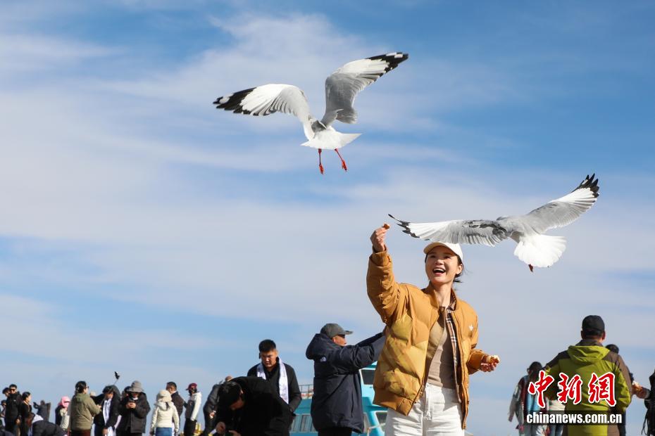 10月22日,青海省海南藏族自治州共和县青海湖畔,游客与水鸟互动。中新社记者 马铭言 摄