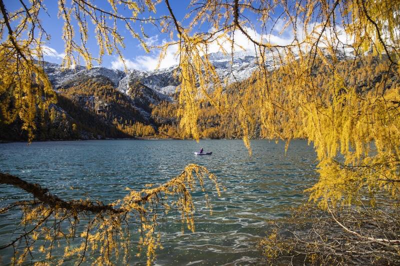近期,海拔4000多米的四川省甘孜藏族自治州道孚县甲玉拉措景区迎来一年中最美的季节。澄澈如镜的湖面倒映着金黄的落叶杉林,远处雪山皑皑,美丽的高原秘境画卷吸引着八方游客。