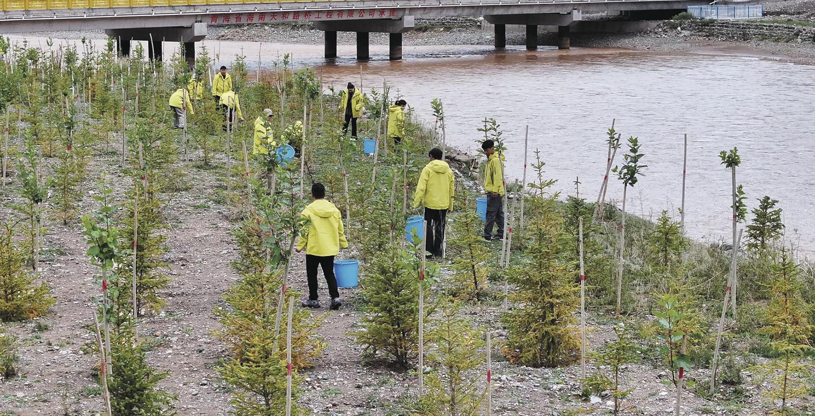 澜沧江源(杂多段)护河志愿服务队在养护树木。