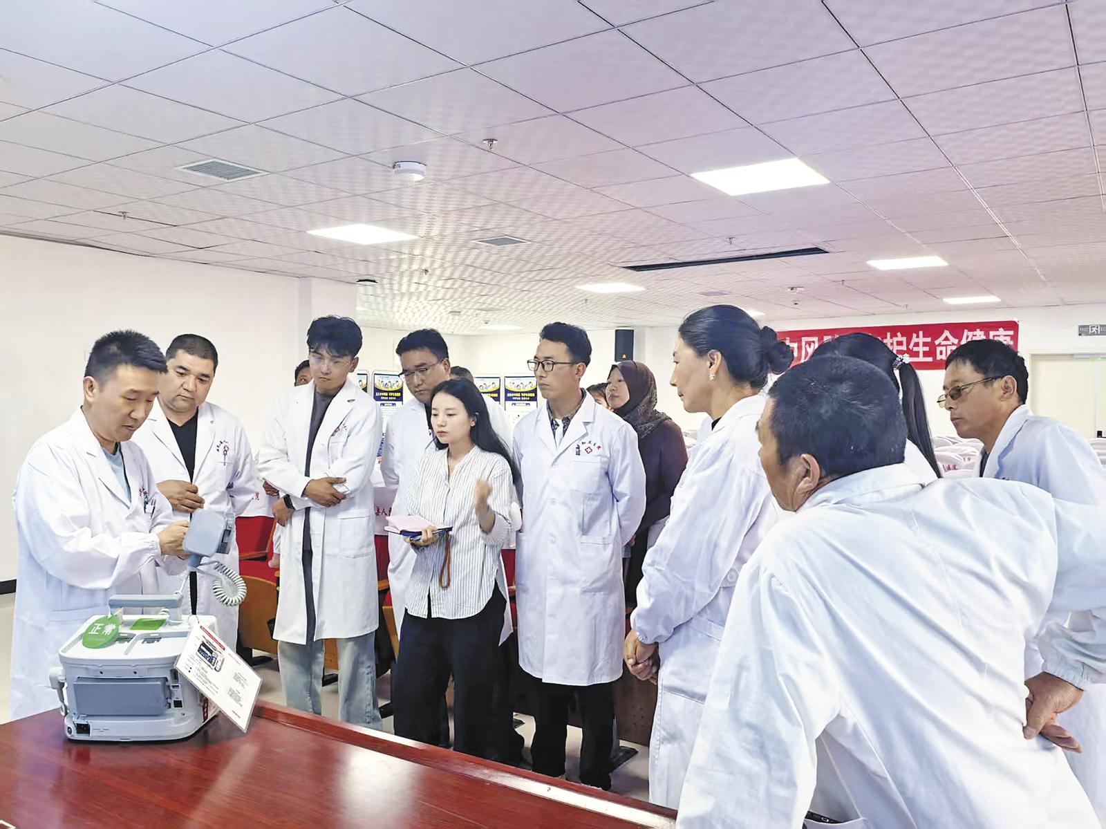 高超医生在为基层卫生院医护人员讲解除颤器的使用。