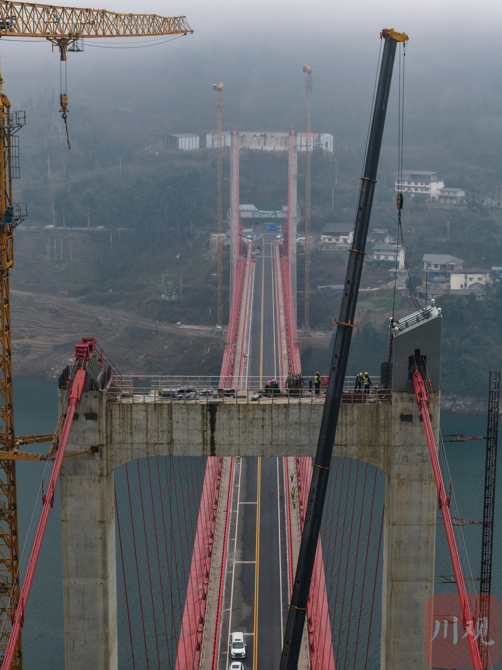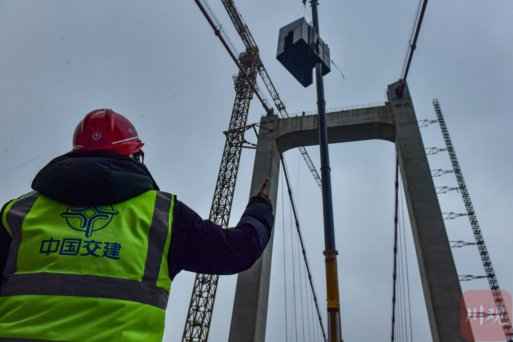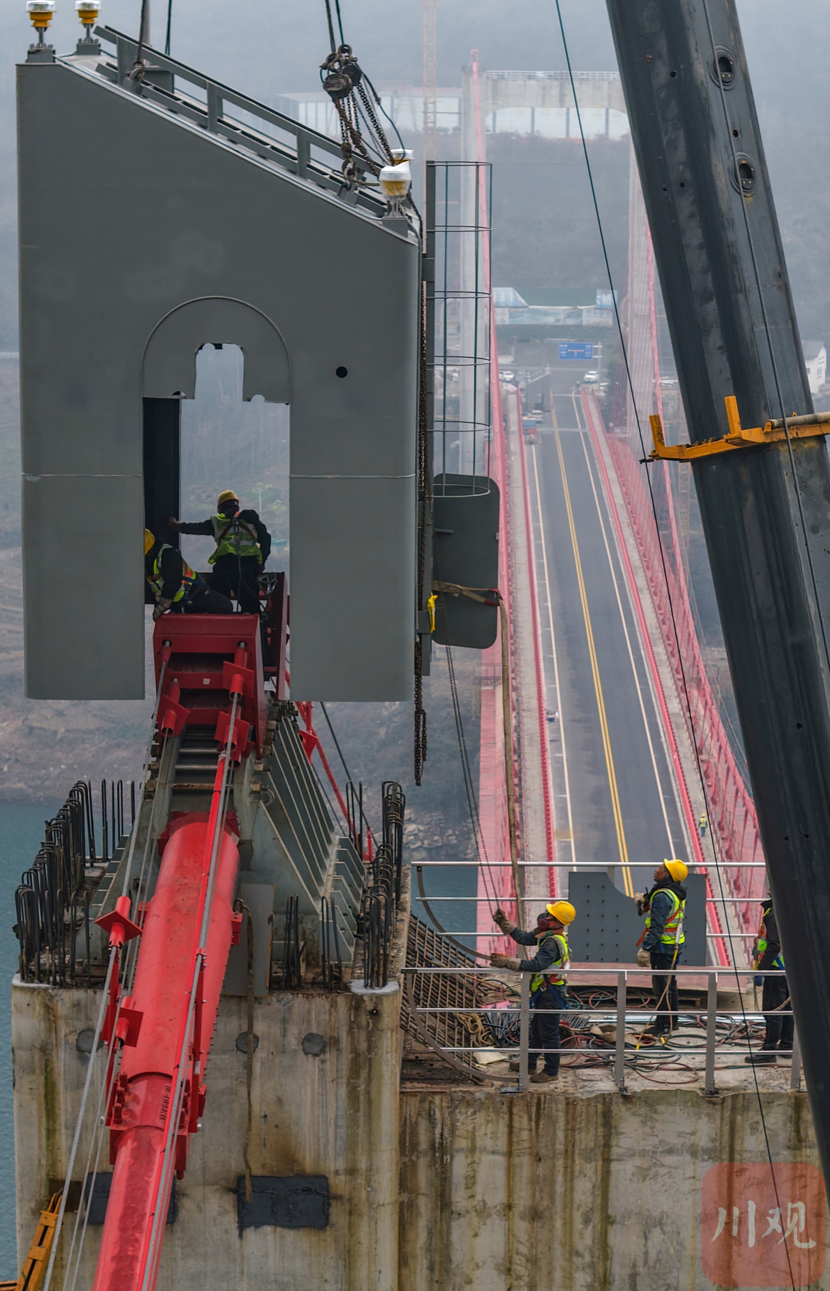 2026年1月19日,国道317线友谊隧道至汶川映秀段改建工程紫坪铺特大桥施工现场,工人正在大桥主塔塔冠吊装。