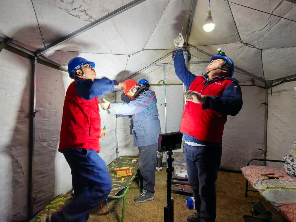 1月26日晚,国网甘南供电公司工作人员为临时安置点应急帐篷接电。国网甘南供电公司供图