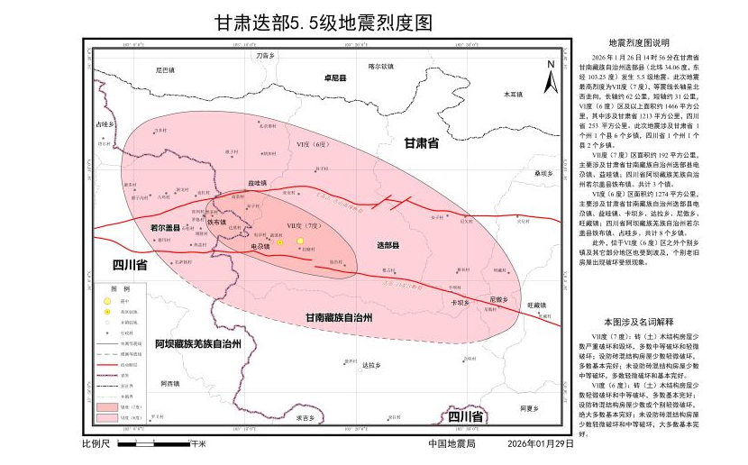 2026年1月26日14时56分,在甘肃省甘南州迭部县发生5.5级地震。地震发生后,中国地震局派出地震现场工作队,依照《地震现场工作:调查规范》(GB/T 18208.3-2011)、《中国地震烈度表》(GB/T 17742-2020)、《地震烈度现场评定》(DB/T 107-2025),对灾区141个调查点展开了实地震害调查,并充分参考震区断裂构造、仪器烈度、余震分布、震源机制等科技支撑成果,确定了此次地震的烈度分布,完成了《甘肃迭部5.5级地震烈度图》编制工作,现正式向社会发布。