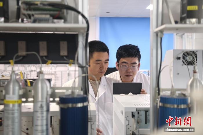 2月5日,在青海省海南藏族自治州共和县的瓦里关全球大气本底站内,罗文昭(左)和乔伟(右)正在检查测量设备。张忠苹 摄