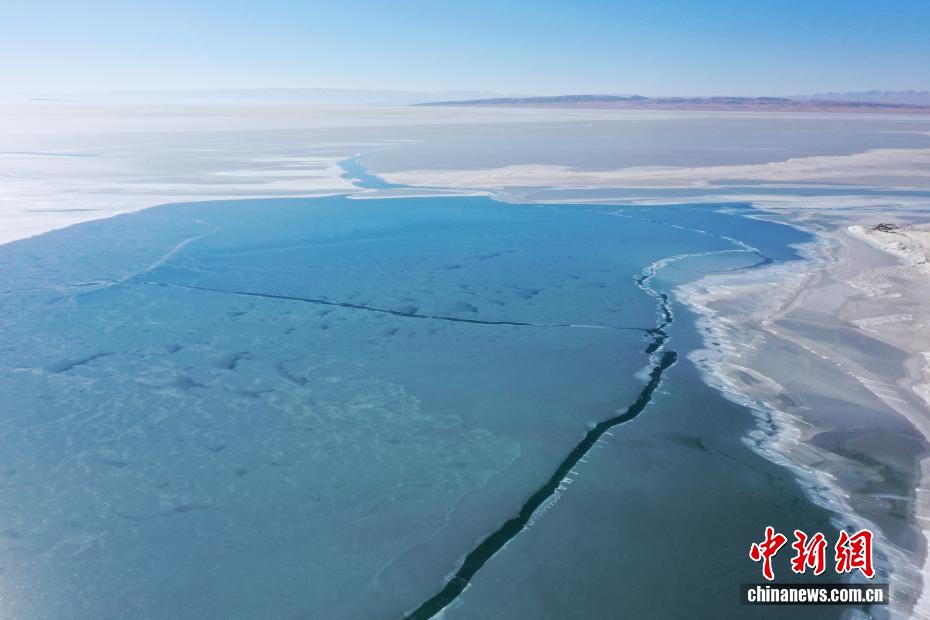 2月13日,青海省海北藏族自治州刚察县圣泉湾景区,中国最大的内陆咸水湖青海湖已进入封冻期。昔日碧波荡漾的湖面被厚冰覆盖,冰裂纹理如大地墨痕,与远处高山相映成画,尽显高原冬日的静谧。(无人机照片)中新社记者 张忠苹 摄