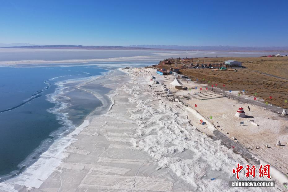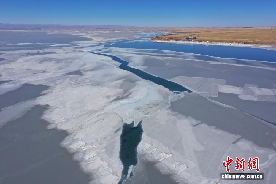 2月13日,青海省海北藏族自治州刚察县圣泉湾景区,中国最大的内陆咸水湖青海湖已进入封冻期。昔日碧波荡漾的湖面被厚冰覆盖,冰裂纹理如大地墨痕,与远处高山相映成画,尽显高原冬日的静谧。(无人机照片)