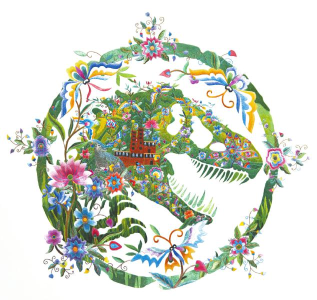 因此,当环球影业慕名前来合作时,双方再次采用产品销售提成的合作模式。杨华珍为环球影业《侏罗纪世界》系列的恐龙LOGO绣上几十种花鸟和植物,当环球影业使用这款LOGO制作文创产品或设计动漫时,她便可参与分成。
