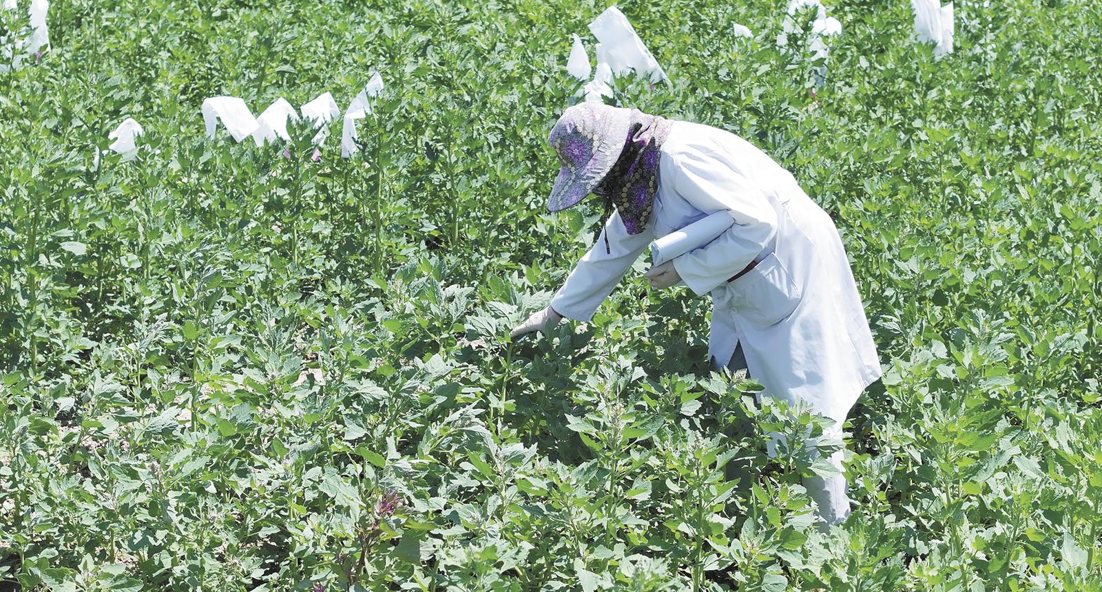 刘洋在田间查看植物长势情况。图片由植物新品种测试(西宁)分中心提供